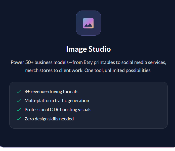 Image Studio 1. Create Stunning Visuals with AI 2. Create stunning visuals for Pinterest, Instagram, Facebook, YouTube, and your blog — no design skills needed. 3. All included with your free AI credits.